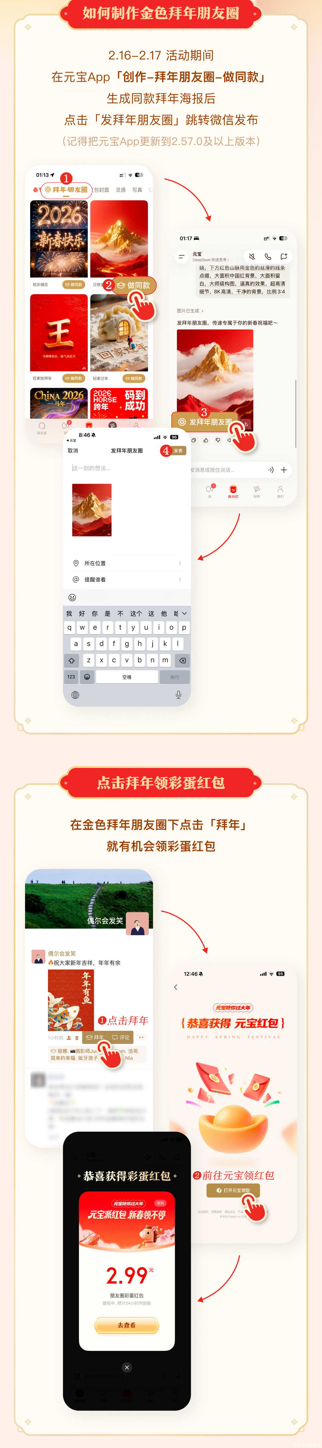 2月16日-17日,用户在元宝App制作拜年朋友圈并在微信发表,即可触发“金色朋友圈”。给别人的金色朋友圈点赞,还有机会掉落红包。